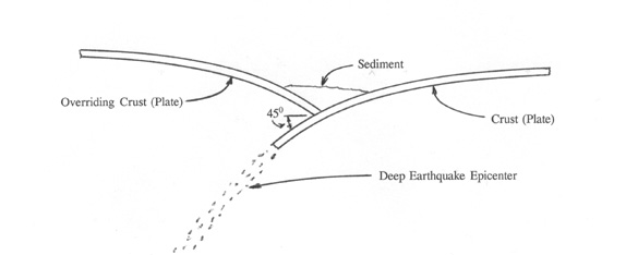 Deep earthquakes usually have epicenters falling within a plane starting at the floor of a deep trench and extending downward at a 45 degree angle. Thus, it is thought the slippage of a plate beneath another plate is the cause of the quakes even though the epicenter is deep within the fluid layer itself.