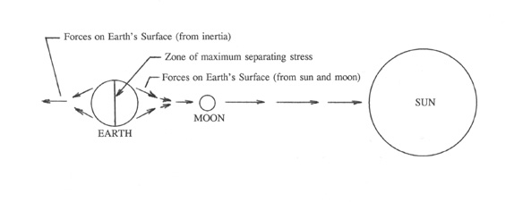 Now we come to the phenomenon called tides. Tides are caused by the gravitational attraction (pull) of one celestial body upon another. The moon pulling upon the surface of the earth, for instance, produces a bulge in the atmosphere (air tide), the water (sea tide), and the land (land tide) as it passes overhead. The moon is small, but is also very close. Its pull upon the far side of the earth is less that its pull upon the near side, which is why it produces a tidal distortion upon the earth's surface. The sun is large, but it is farther away. So the difference between its pull upon the far side of the earth and near side is not so great as in the case of the moon. The other planets (Venus and Jupiter particularly) also produce tidal forces upon the earth.The highest tides (greatest pulls) occur when the planets (including the sun and moon) align themselves either in conjunction or opposition. When, for instance, at new moon the sun and moon align to pull upon one side of the earth, the effect is as if one were attempting to pull the skin off an onion.