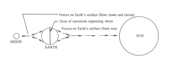 When the zone of maximum stress coincides with an earthquake fault zone, the forces tend to pull apart the crust on either side of the fault so that friction between cratons is reduced and one part of the crust may then slip against the other. Also, strong tides distort the surface of the earth and move heavy bodies of water horizontally to cause more stress on areas of friction regardless of where they may be.