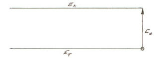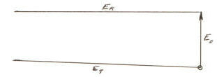 Thus, E02 + EK2 = ET2.When an object such as the electron is at rest (perfectly still) relative to the nether, there is no EK. This means that there is no side to be shown for kinetic energy, so we show the "triangle" as only a vertical line which is supposed to be E0 lying on top of ET. Next, we anchor the bottom ends of E0 and ET so that ET may rotate counterclockwise. This vertical line is two vectors (one on top of the other) which illustrate how E0 and ET are equal when the the electron is at rest relative to the nether. [In reality, the electron is never completely at rest relative the nether.]