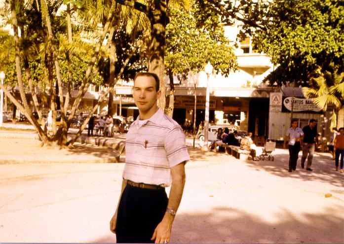 Wearing civvies in Brazil, as a "world traveler." This was either taken in Rio or at a stopover on a downrange trip while in Military Air Transport Service. The squadron bought most of its bad coffee in Brazil and mixed it with Maxwell House to make something that still tasted terrible but kept us awake on long missions. Downrange missions were to supply our stations used for tracking rockets fired from Cape Canaveral. Trips to Rio de Janeiro were usually for carrying VIP's.